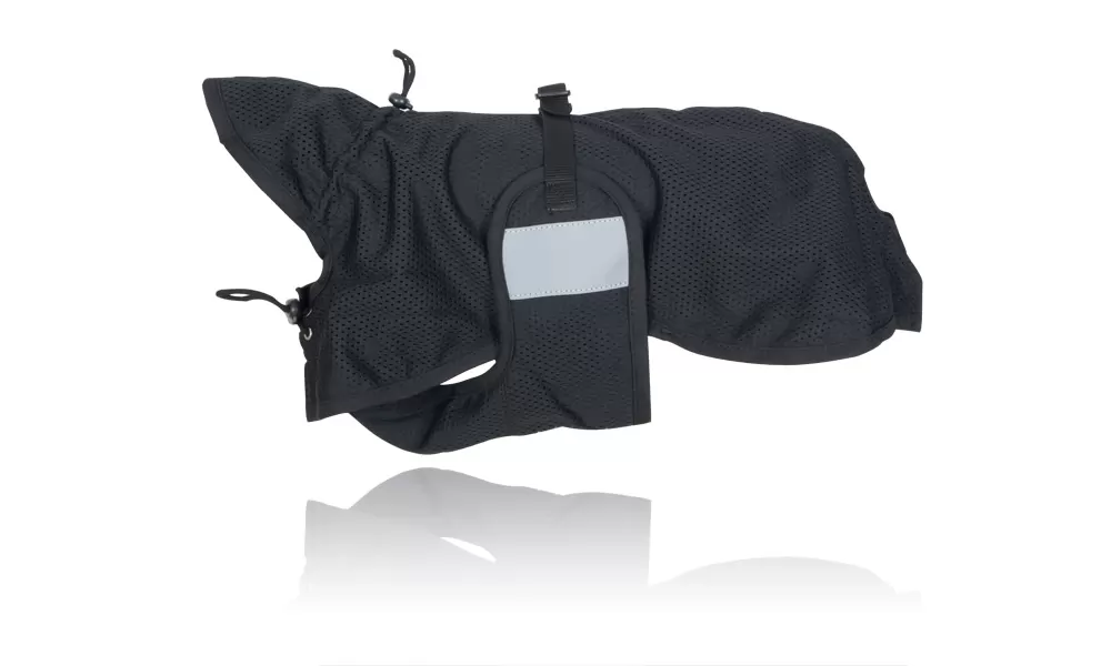 Lacing at the front of the blanket allows for adjustability. Attached wrap-around belly strap keeps blanket in place with opening for leash and dogs tail. Blanket has reflectors on each side for enhanced visibility.