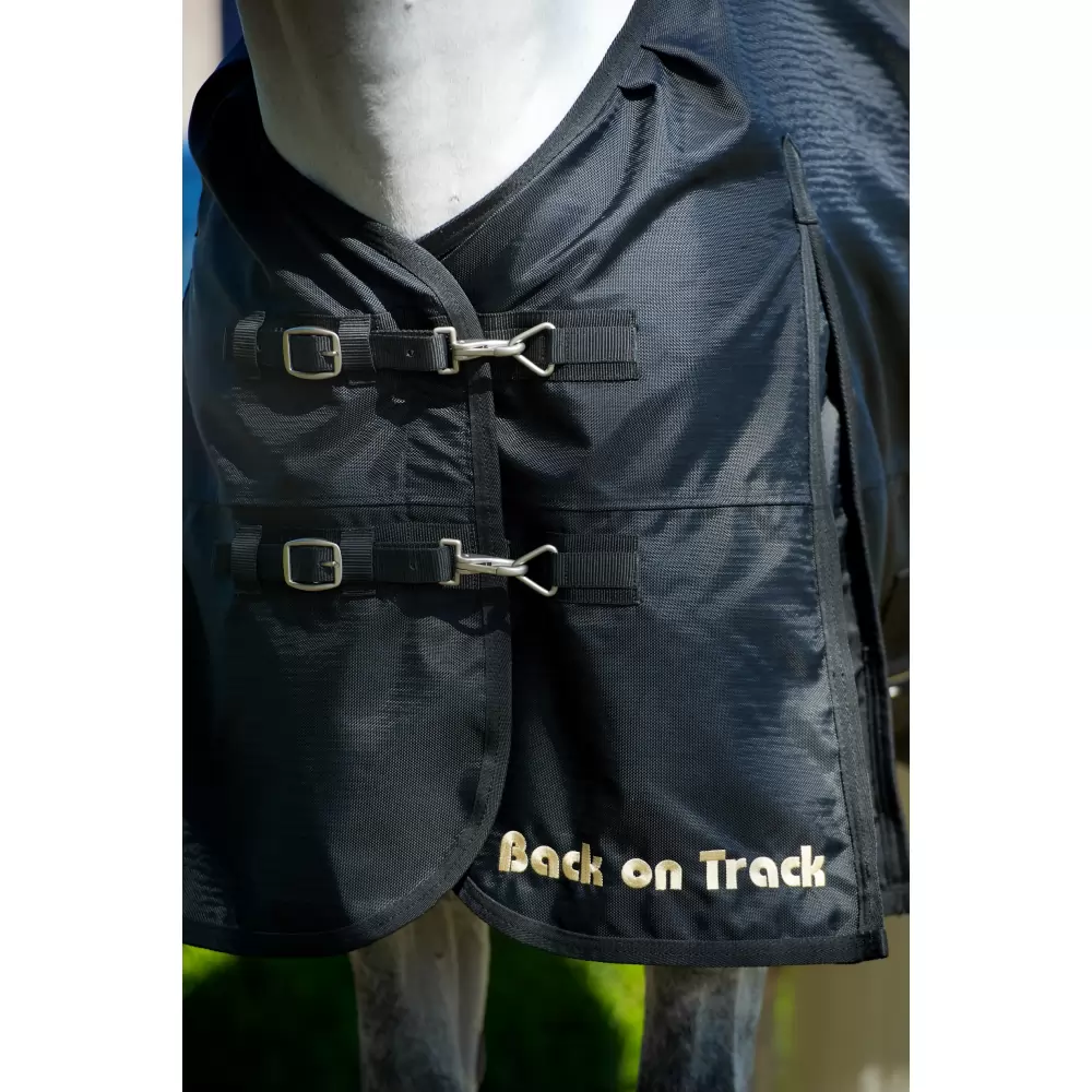 The Back on Track Therapeutic Turnout Sheet has been designed with shoulder gussets to provide your horse with the utmost range of freedom in the shoulders. Utilizing ourWelltex technologycombined with 1680 denier, this water-resistant Turnout Sheet is extremely strong, helping to keep your horse dry and warm and while allowing your horse to benefit from our far infrared thermal effect. The sheet comes with a tail flap, adjustable surcingles, and elastic leg straps to ensure it stays in place during rolling and playing. The Back on Track Turnout Sheet is not designed to be used with the Mesh Neck Cover.