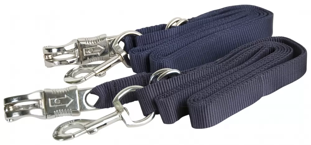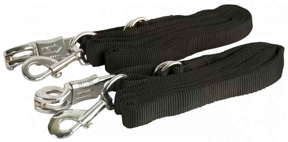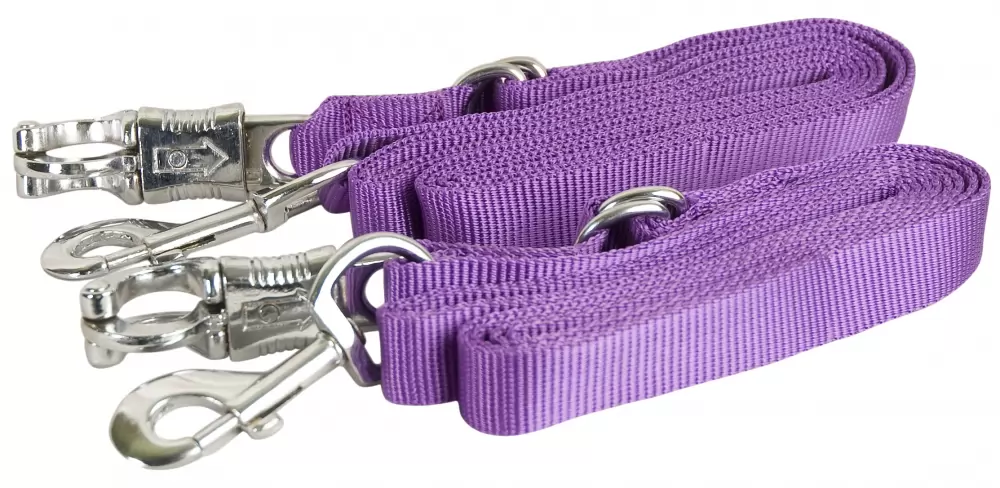 A pair of classically designed Cross Ties constructed of a heavy duty single ply Nylon. Features a nickel plated snap at one end and a nickel plated quick release at the other end. Completely adjustable from 5′ to 9′. Cross Ties are a necessity for the aisleway or washstall. Also a great item to take along to horse shows when you are stabling for grooming and tacking up.