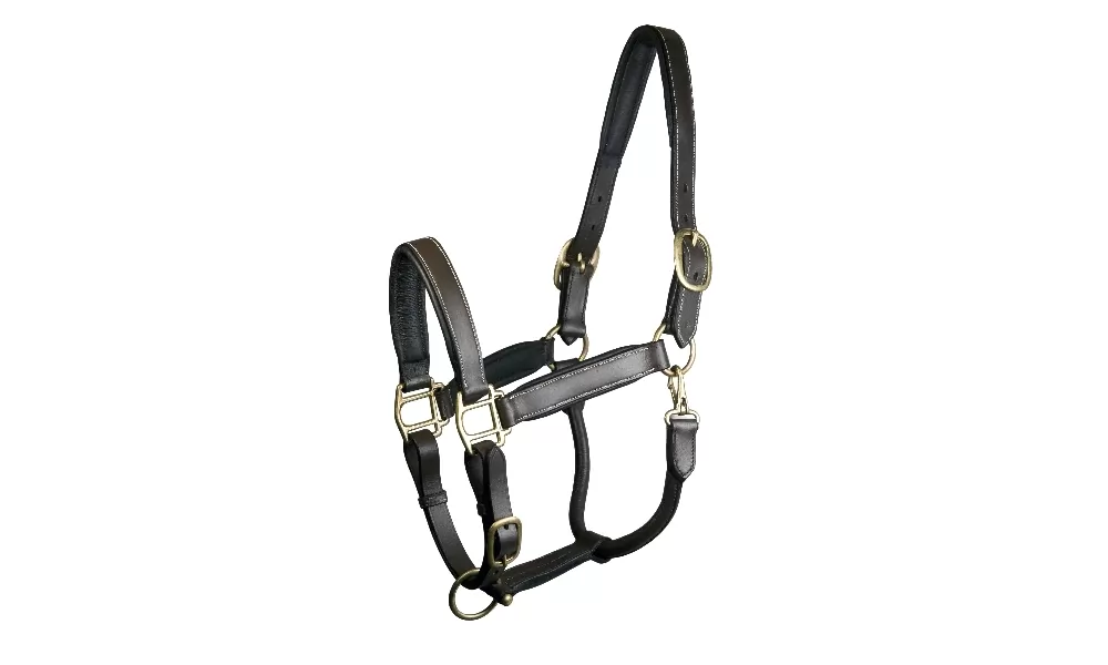 Made of a supple leather, features brass plated hardware, double buckle crown, snap on the side, adjustable chin, rolled throat and is self padded on the noseband, crown piece and the cheek pieces. This halter is great for anything from turn-out to trailering.