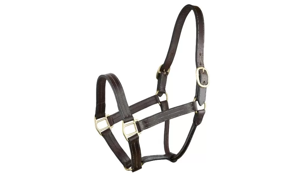Made of a supple, pre-conditioned leather. It is crafted in a 1″ triple stitched leather on the cheeks, nose and chin, has a double buckle crown, has solid brass hardware and a rolled throat