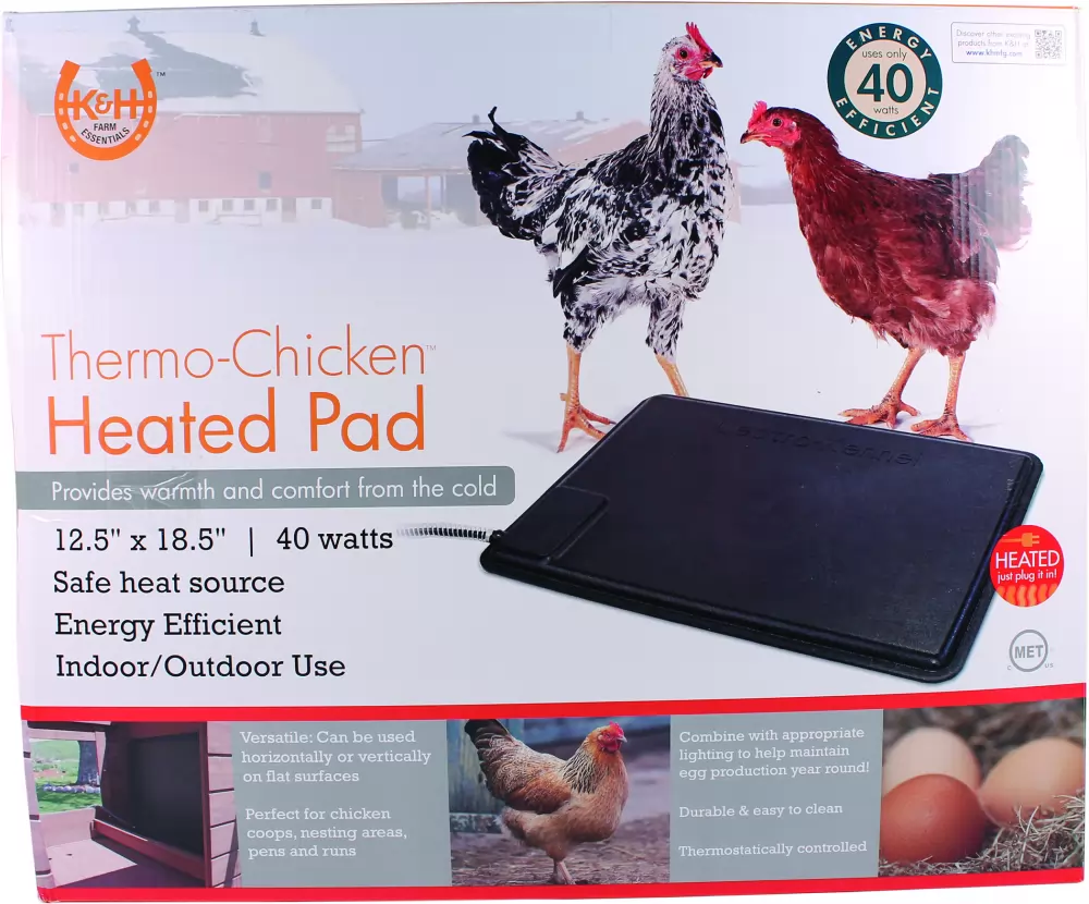 Keep your chickens nice and toasty with the K&H Pet Products Thermo-Chicken Heated Pad. Great for the first stages of life to maintain mandatory heat requirements, its also perfect for all ages when the frigid temperatures of winter arrive. The internal thermostat is pre-set to the ideal temperature, which helps to prevent chilling and pasting in baby chicksensuring a healthy start to life! Its only 40 watts for energy efficiency, and it can be placed on the floor or mounted to a wall for complete versatility.