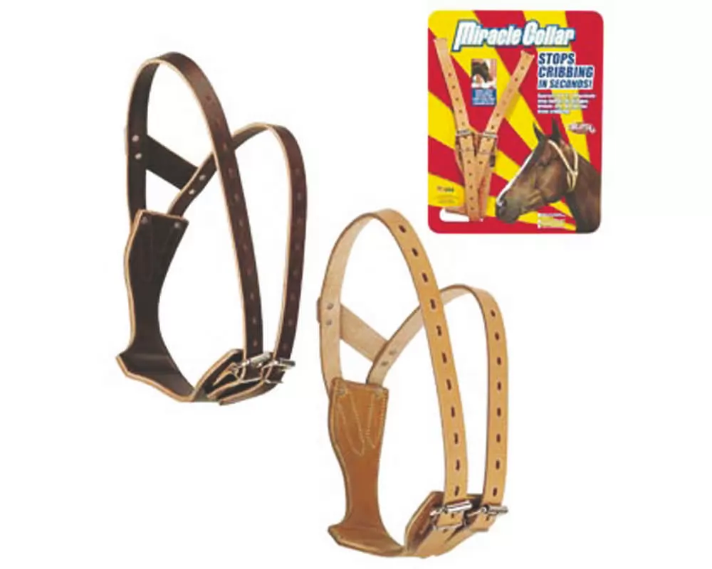 Patented cribbing collar! Carefully handcrafted from high quality, weather-resistant harness leather from strength and gentleness to the hair coat. Anatomically-correct fit only applies pressure when horse cribs, so it can be worn while eating and drinking. Harness leather.