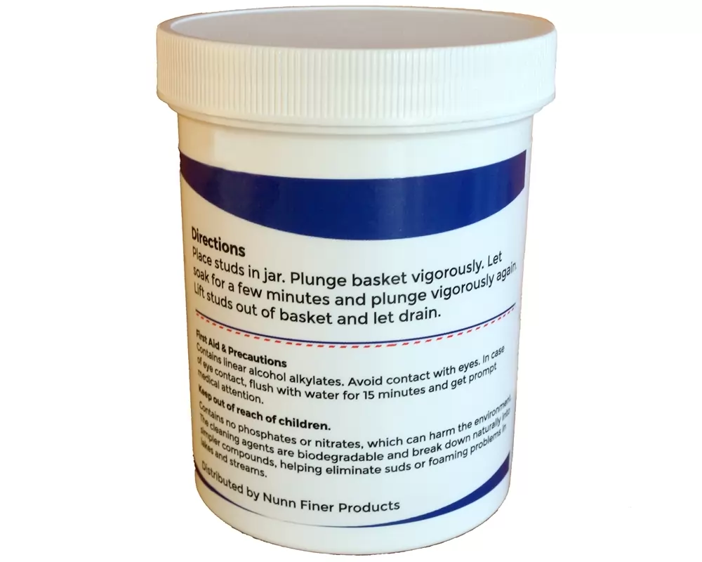 Stud Suds is a quick, convenient way to clean and lubricate studs immediately after use! This easy to use container allows you to drop your studs in, close, and shake. The cleaner then settles to the bottom through a drain, giving you easy access to your shiny clean studs.