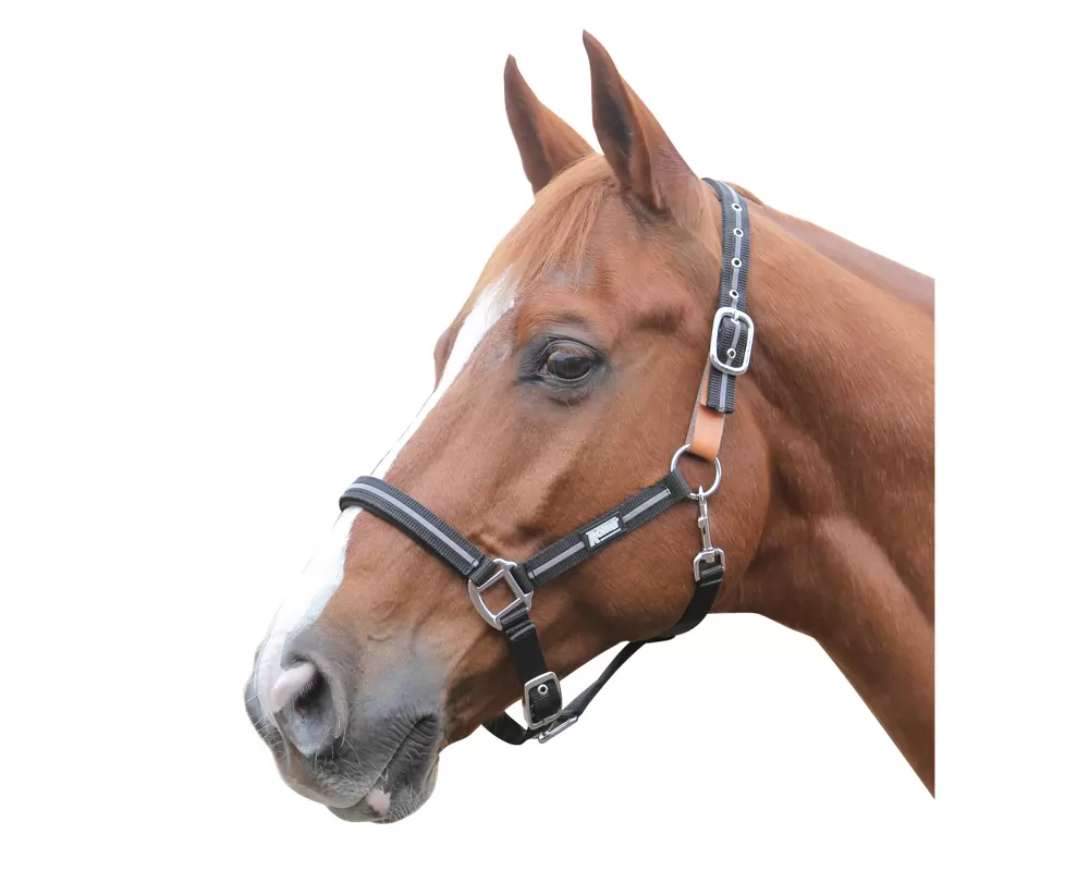 Keep your horse both safe and visible in the Roma Reflective Breakaway Halter. This nylon halter features a breakaway link on the crown and reflective strips on the front facing portions of the halter.