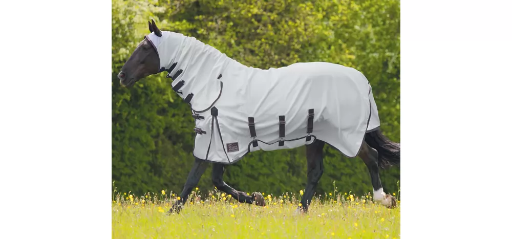 The Shires sweet-Itch Combo offers complete protection from biting insects. Highly breathable, lightweight 600 denier ripstop fabric will resist field wear and tear while still being soft. Ample fabric in the integrated neck and stretch ear panel permits unhindered grazing and fastens with four touch- closes straps. The sheet also includes anti-rub lining to the neck, chest and shoulders for comfort, deep shoulder gussets, belly flap with three adjustable surcingles straps, large tail flap and adjustable fillet strap. Machinewash cool with non-detergent soap.