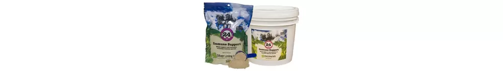 Supports the immune system, which may aid in clearing up a wide range of seemingly unrelated issues. Everything put into or onto horses is used or not used by their bodies on a cellular level. Elements of foods and topical substances that are not used need to be evacuated from the body, which a healthy immune system is able to do via the liver, kidneys, blood, lymphatic, digestive system, skin, etc. With all that is thrown at horses today from immunizations to pesticides, to reduced grazing and increased travel schedules their immune systems can easily become overwhelmed at the cleanup work required. #24 Immune Support may be beneficial for compromised immune systems, low white blood cell count; bacterial and fungal issues; exposure to chlorinated water and pesticides; blisters; blood warts; swelling in body; stocking up in legs; rough hair coat or won’t shed normally; lethargic, weak, not working to normal levels, or over-exerted when asked to; lumps under the tail; mouth sores, sore throat, nasal mucous discharge; stress; underweight, and pronounced abnormal wrinkles over eyes.Contains eluthro, garlic, olive leaf, red clover, rosehips, barberry, echinacea, parsley, wheat grass, licorice, plantain, sarsaparilla and cascara.Directions for use: Give 1 scoop daily with natural diet for horses 1,000-1,200 lbs. Safe use in pregnant animals has not been proven. 1 Tbsp scoop enclosed. 1 lb = 60 day supply.