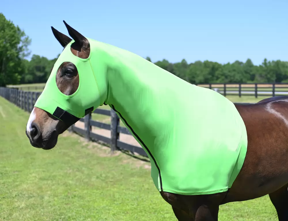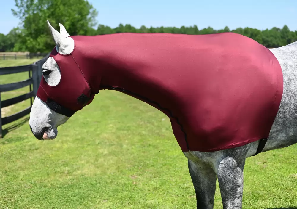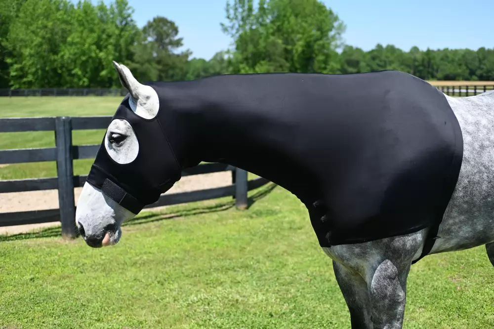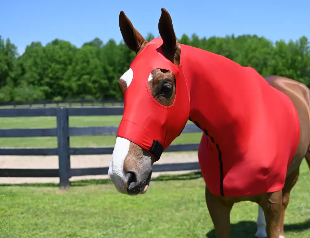StretchX 4-way Spandex Slicker Collection. Full Separating Zipper Slicker Hood is made from 8oz 4-way stretch 4-way stretch spandex. High quality reinforced zipper for easy-on/off. No center seam face design and extra large no-rub eye holes. Machine washable (gentle cycle, warm water, fasten velcro securely. Dry low heat only.