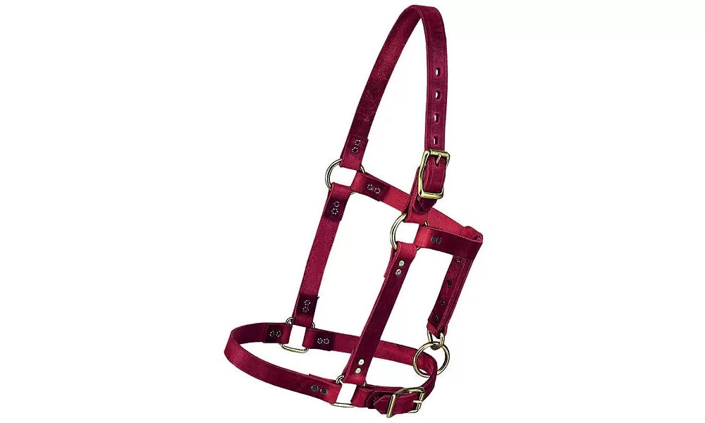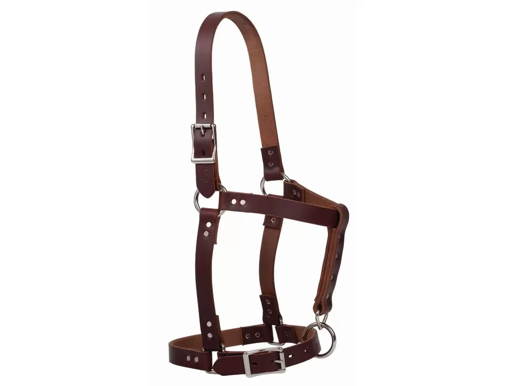 Simple, riveted design is available in burgundy latigo leather, oiled canyon rose harness leather or Hermann Oak russet harness leather for reliable performance. Catch strap on suckling size for ease in catching foals. Nickel plated hardware.