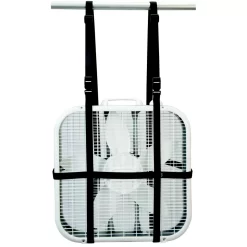 Utilitze and inexpensive box fan to cool your barn. Easily hang a box fan for maximum circulation with this adjustable box fan holder. Made from heavy-duty 1″ wide black nylon webbing, this box fan holder will accommodate most 20″ box fans. Black plastic quick-release buckles offer easy on and off and black plastic slides provide precise adjustment.