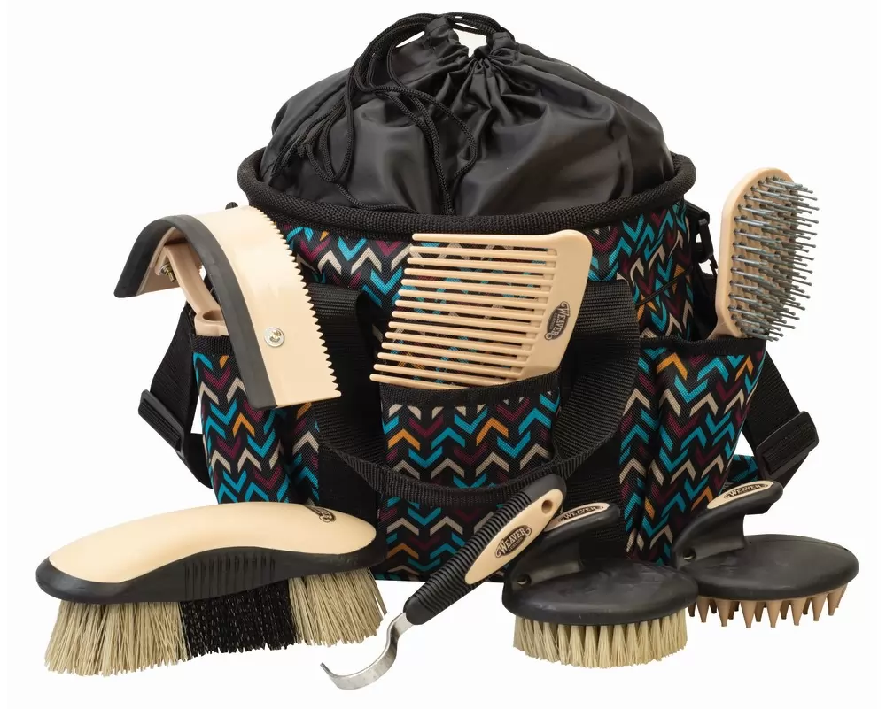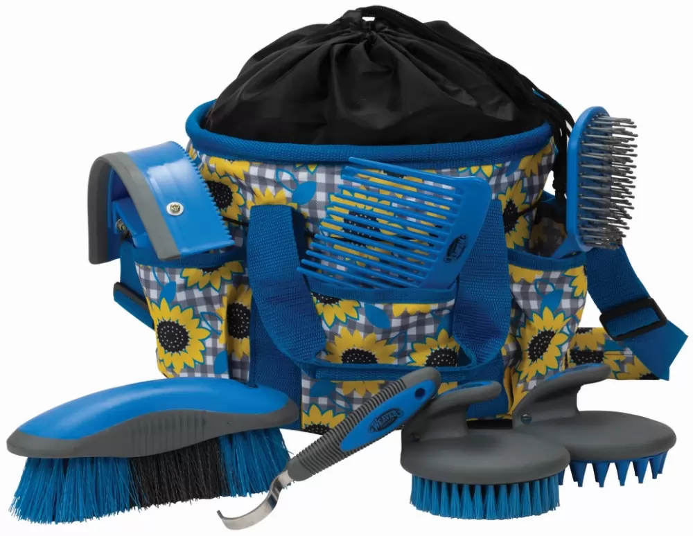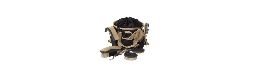 Perfect for any beginner, this 7-piece assortment features a great selection of grooming essentials in a durable nylon tote bag for easy organization and carrying. The handy tote bag features six exterior pockets for added storage, a wire-reinforced top for stability, a convenient top drawstring closure, plastic feet that protect bottom of bag, a flexible retaining strap, comfortable webbing handles, and an adjustable, padded shoulder strap attached with snaps for easy on and off. Includes a comb, hoof pick, palm held curry comb, palm held face brush, mane and tail brush, dandy brush and sweat scraper/coarse curry combo.